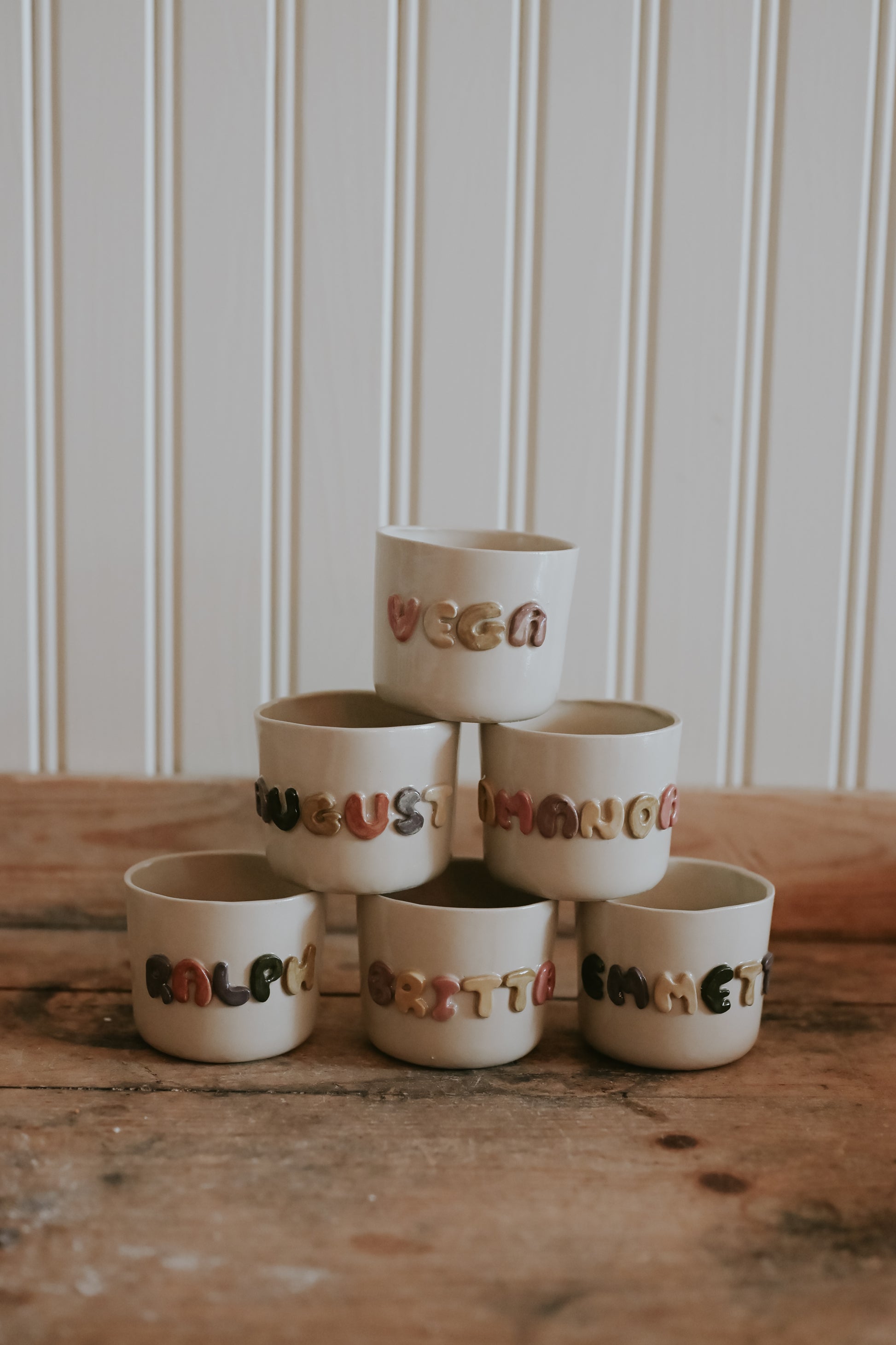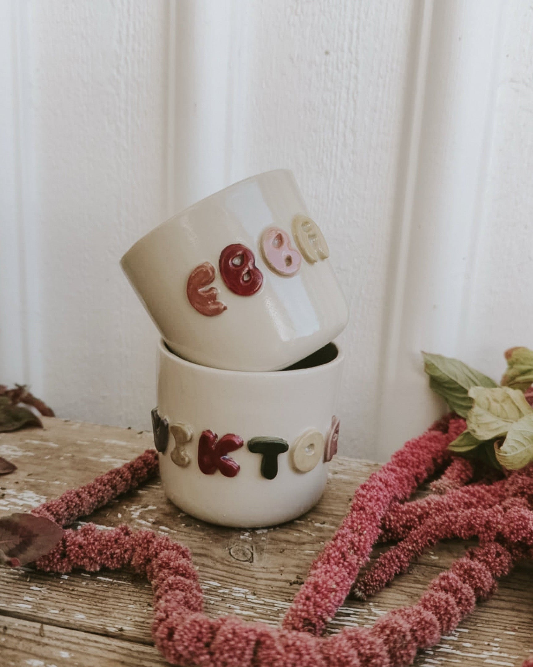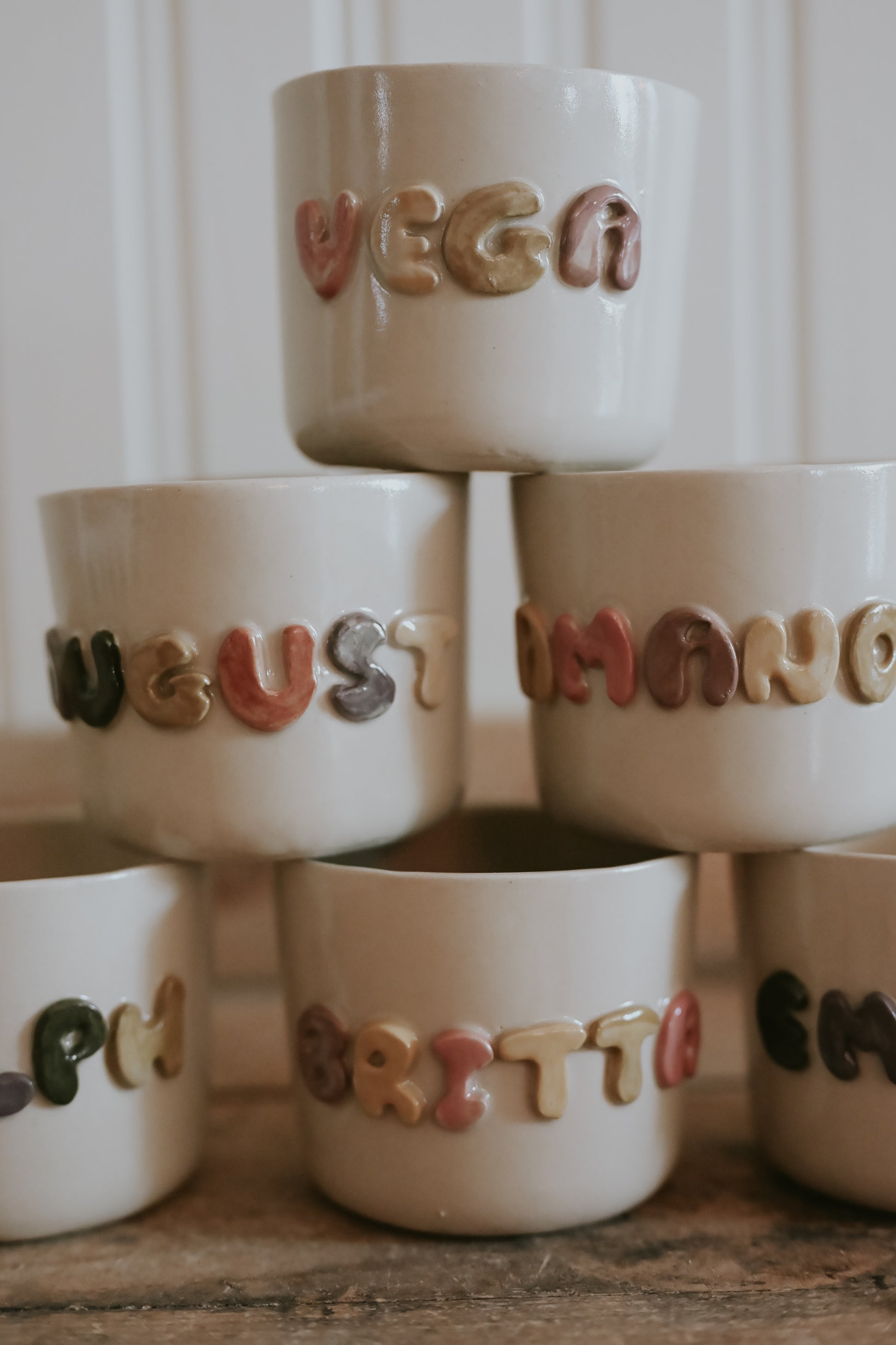 Välj en bokstav eller ett namn – perfekt som gåva eller till dig själv. Varje mugg formas och textas för hand, vilket gör den unik, precis som personen den är till för.